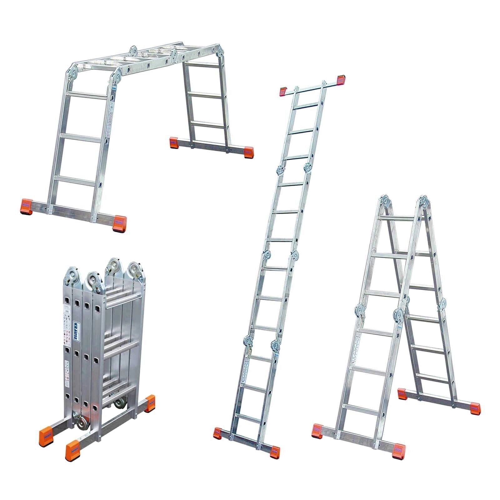 Stroyrent offers a U-shaped folding ladder for rent. It can be used in 3 variants - as a support, double-standing or as a work platform. The multifunctional ladder, model Krause Multimatic, has four-part hinges that lock quickly and easily. It has non-slip two-component heel plugs - the first ensures a stable connection with the shoulder, and the second prevents unwanted sliding of the ladder, ensuring a high grip on the base. Besides being versatile and easy to use, the U-shaped ladder is also very practical . Compact dimensions allow transportation in the trunk of a car.