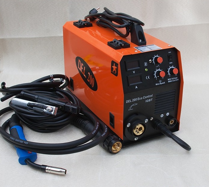 Del ecocontrol este un aparat de sudură combinat care oferă multiple funcții, potrivit atât pentru uz profesional, cât și pentru uz casnic. Poate fi utilizat ca aparat de sudură cu arc sau dispozitiv de alimentare cu sârmă, cu opțiunea de a lucra fără gaz, ceea ce îl face extrem de versatil și convenabil pentru diverse sarcini de sudură.